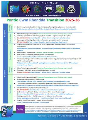 - Our Transition Cluster worker (Ms Stephanie Jones) works within our cluster of schools to ensure an effective and smooth transition process for all pupils – Ms Stephanie Jones spends the Terms 2 and 3 of Year 6 working with pupils in the cluster junior schools then Term 1 of Year 7 helping pupils to settle at Ysgol Gyfun Cwm Rhondda