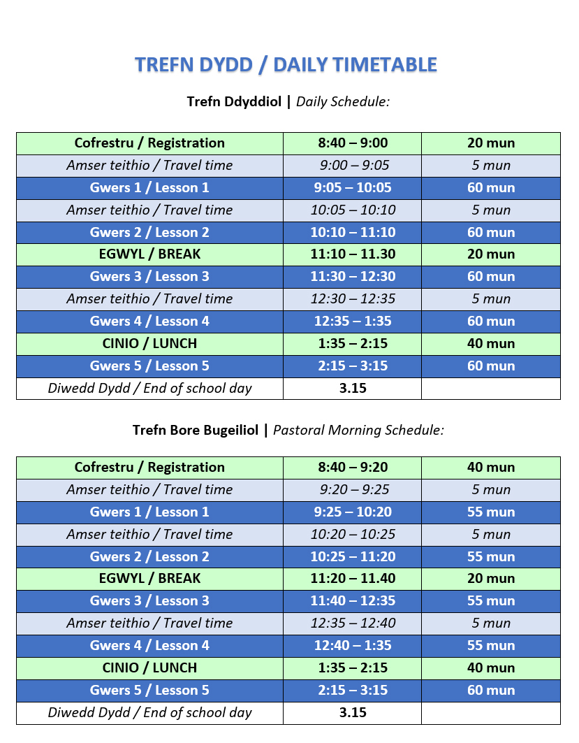 The school week is organised into 25 Lessons (5 lessons a day). The day also incorporates registration and assembly time, break time and lunch time.